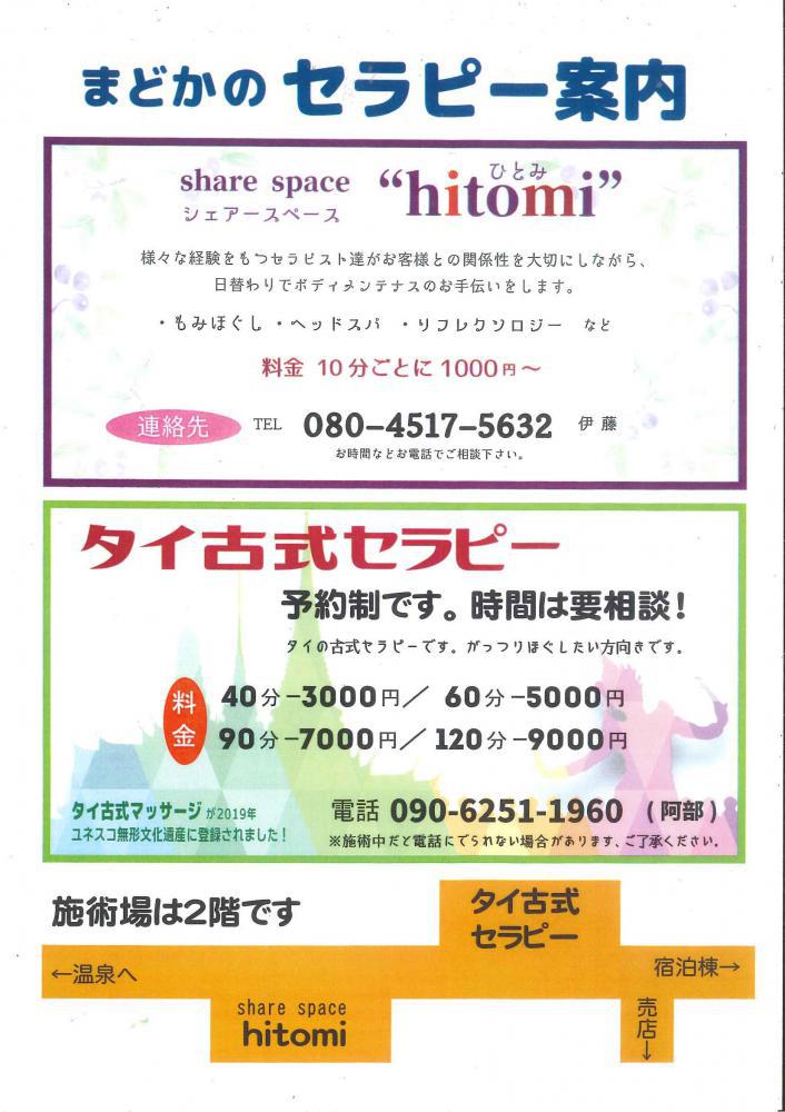 まどかのセラピーのご案内●シェアースペース“hitomiひとみ”・もみほぐし ・ヘッドスパ ・リフレクソロジー など 料金:10分ごとに1,000円〜 連絡先:TEL080-4517-5632:伊藤 お時間などお電話でご相談ください。●タイ古式マッサージ 予約制:時間は要相談 がっつりほぐしたい方向きです。料金:40分-3,000円/60分-5,000円 90分-7,000円/120分-9,000円予約先:TEL090-6251-1960:阿部※施術中だと電話に出れない場合があります。施術場所はまどか温泉棟の2階に各コーナーがあります。ぜひ、お電話で各セラピーにお申込み、ご相談ください。