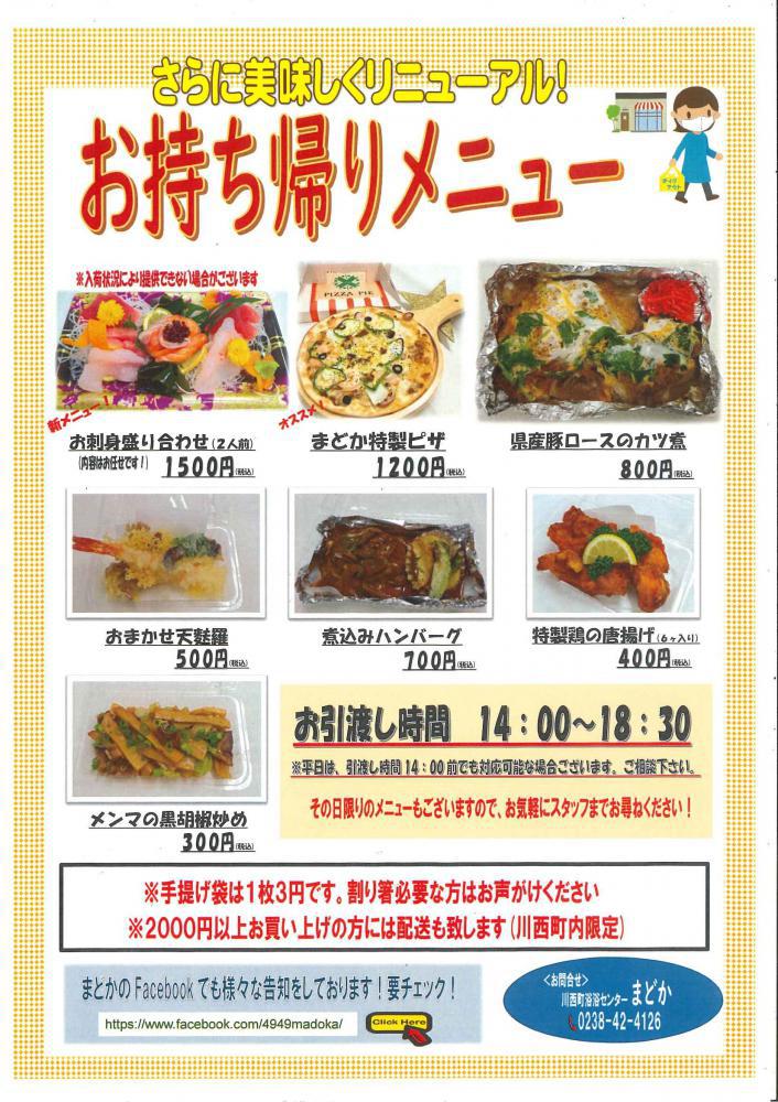 R3.4/12(月)〜お持ち帰りメニュー更に美味しくなりリニューアル!!◎お刺身盛合せ(2人前)内容おまかせ・・・1,500円税込 ※入荷状況により提供できない場合があります。◎まどか特製ピザ・・・1200円税込◎県産豚ローズのカツ煮・・・800円税込◎おまかせ天麩羅・・・500円税込◎煮込みハンバーグ・・・700円税込◎特製鶏の唐揚げ(6ヶ入り)・・・400円税込◎メンマの黒胡椒炒め・・・300円税込※お引渡し時間 14:00〜18:30※平日は14:00前でも引き渡し対応可能な場合がございます。ご相談下さい。※その日限りのメニューもございますので、お気軽にスタッフにお尋ねください!※2,000円以上お買上げの方には配達もいたします(川西町内限定)※手提げ袋は1枚3円です。割箸必要な方はお声掛け下さい。 浴浴センターまどか TEL 0238-42-4126