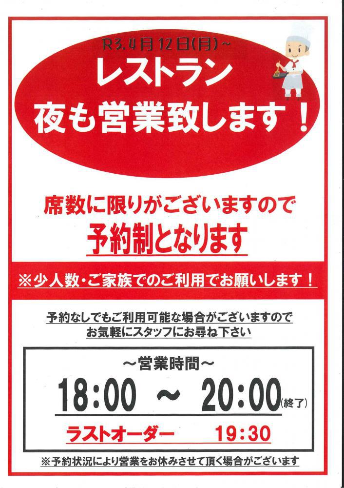 R3.4/12(月)〜まどかレストラン燦燦夜も営業いたします!!=営業時間=18:00〜20:00終了(ラストオーダー19:30)※席に限りがございますので、予約制となります。※少人数・ご家族でのご利用でお願い致します。※予約なしでもご利用可能な場合がございますので、お気軽にスタッフにお尋ね下さい!!