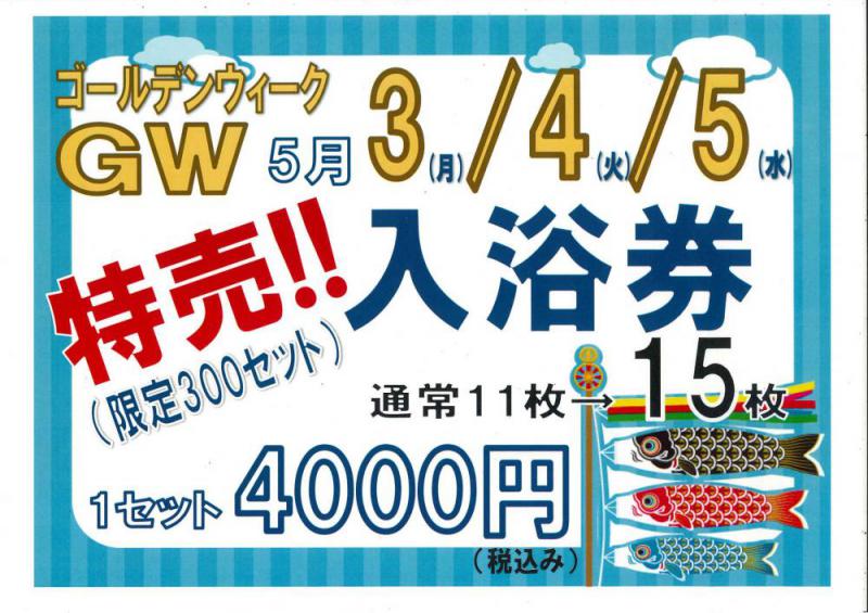 まどかゴールデンウイーク温泉入浴券特売5月3日(月)・4日(火)・5日(水)の3日間限定1日100冊!!通常11枚→15枚で4,000円税込