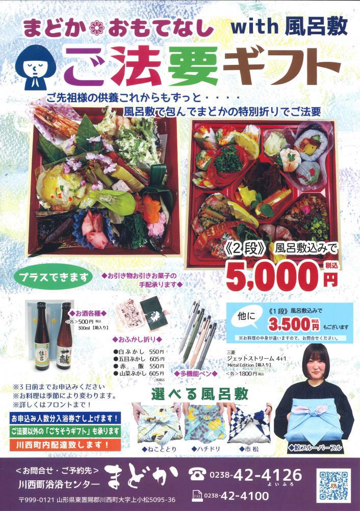 まどかおもてなしご法要ギフト with風呂敷風呂敷に包んでまどかのお料理を特別折りで差し上げる新しいスタイルの提案です。●5,000円税込(2段)風呂敷込みで●3,500円税込(1段)風呂敷込みで※他にお引き物・おふかし折り・お酒など手配賜っております。ご相談下さいませ。風呂敷は選べるようになっております。※まどかの入浴券お申込み個数分差し上げます。※川西町内配達いたします(町外要相談)