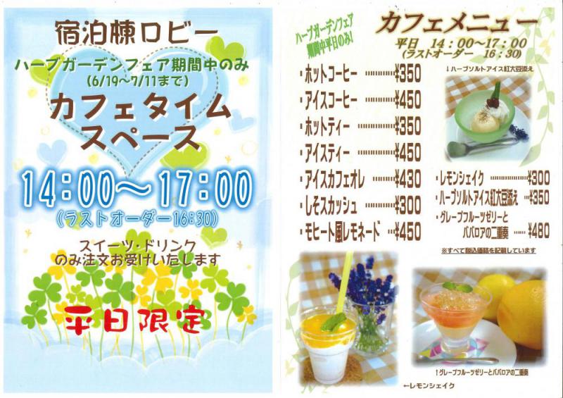 ハーブガーデンフェア期間中(6/19〜7/11)平日限定!宿泊棟ロビーを14:00〜17:00(ラストオーダー16:30)カフェタイムスペースとしております。メニューはドリンク、スイーツのみとなっております。ちょっとしたおしゃべりタイムいかがですか〜※安心安全でご利用いただくために、感染症対策取り組んでおります。