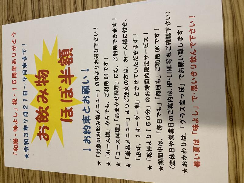 明日、令和3年7月21日は「和膳・味よし」として、リニューアルオープンさせていただいてから、なんと15周年の記念日となります(^人^)