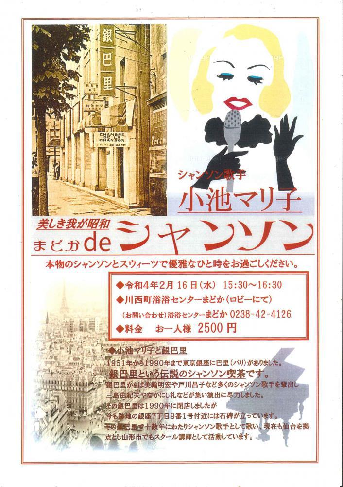 小池マリ子のまどかdeシャンソン本物のシャンソンとまどか特製スイーツで優雅なひと時をお過ごしください。2月16日(水) 15:30〜16:30まどか宿泊棟ロビーにて お一人様・・・2,500円税込シャンソン歌手:小池マリ子銀巴里という伝説のシャンソン喫茶で十数年にわたりシャンソン歌手として歌い、現在も仙台を拠点に山形市でもスクール講師として活動している方です。