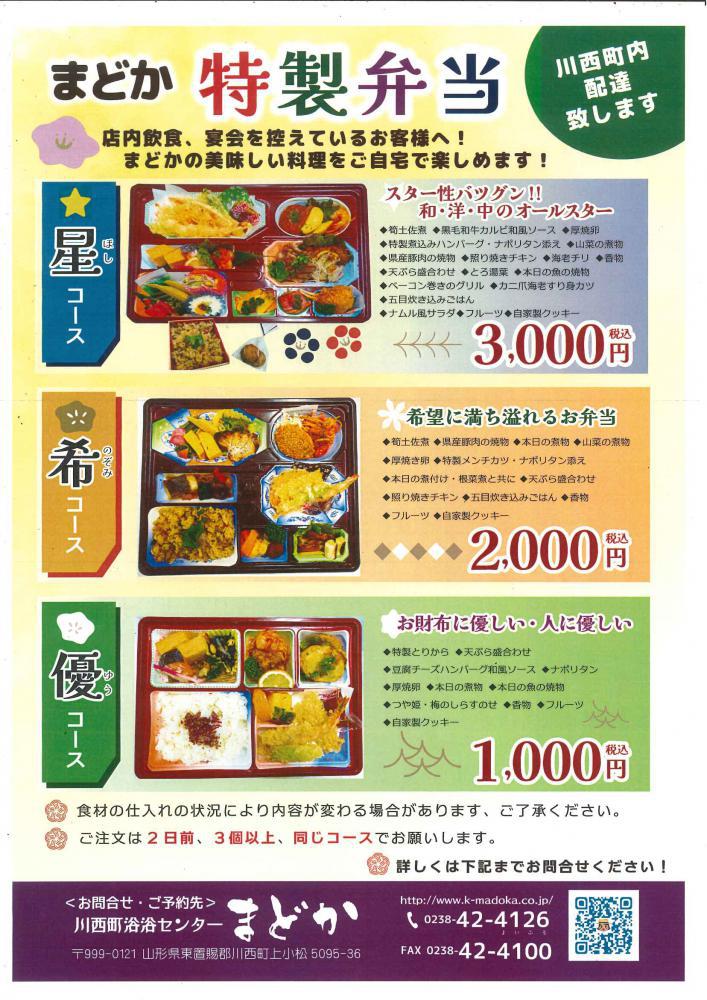 まどか特製弁当R4.4月〜当面の間お弁当の受付はお休みさせていただきます。ご了承くださいませ。 店内飲食、宴会を控えているお客様 まどかの美味しい料理を自宅でも楽しめます♪●〜星〜3,000円税込み・・・スター性バツグン!!和洋中のオールスターお弁当●〜希〜2,000円税込・・・希望に満ち溢れるお弁当●〜優〜1,000円税込・・・お財布に優しい・人に優しいお弁当※ご注文は、2日前、3個以上、同じコースでお申込み下さい。※食材の仕入れ状況により内容が変わる場合があります。ご了承ください。※お届け要相談!!お申込みは、お電話で!!0238-42-4126まで