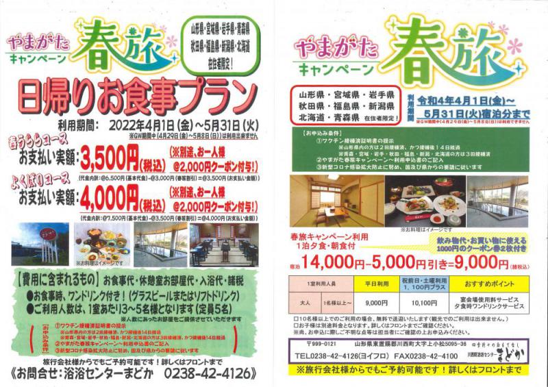 まどかの春旅キャンペーン日帰りコース・宿泊コースのご案内です期間は5/31まで、お早めにご予約お待ちいたしております。ご予約・お問い合わせは 0238-42-4126(ヨイフロ)まで