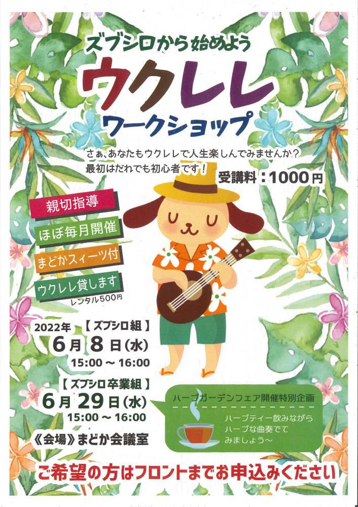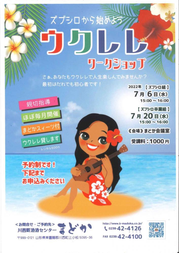 2022.6月のウクレレワークショップ日程です【ズブシロ組】 6月8日(水) 15:00〜16:00【ズブシロ卒業組】 6月29日(水) 15:00〜16:00 ●まどか会議室 ●参加料:1000円税込★まどか特製スイーツ付き(毎回違うスイーツです) レッスンの後は皆さんで特製のスイーツタイムです これもまた楽しみですね♪ ★毎月開催・親切指導・ ★ウクレレレンタルできます(レンタル料500円)★お申込みは:浴浴センターまどかTEL0238-42-4126(ヨイフロ)まで!!