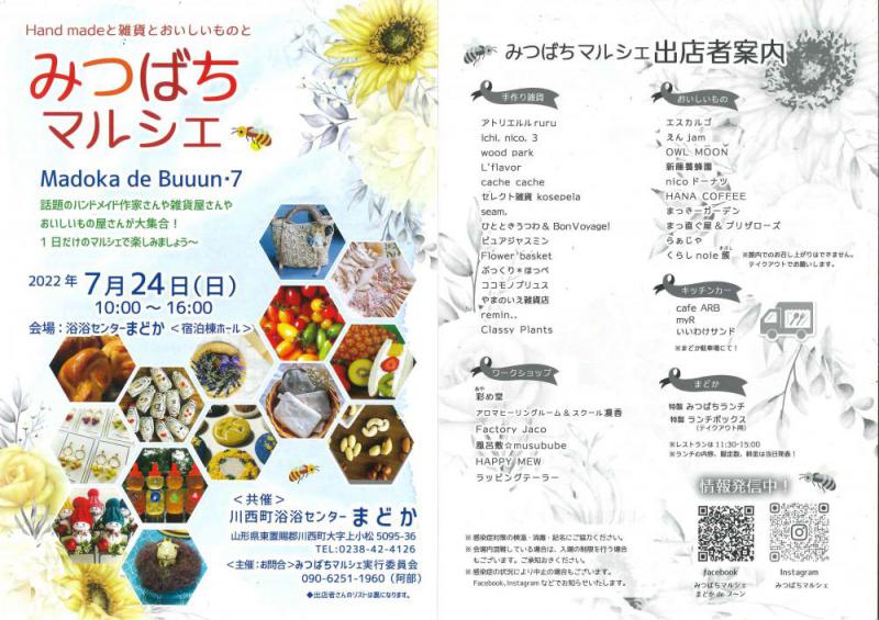 また今年も開催!!2022.7月24日(日)Hand madeと雑貨とおいしいものと”みつばちマルシェ”10:00〜16:00開場:浴浴センターまどか話題のハンドメイド作家さんや雑貨屋さんやおいしいもの屋さんが大集合!!〜1日だけのマルシェで楽しみましょう〜