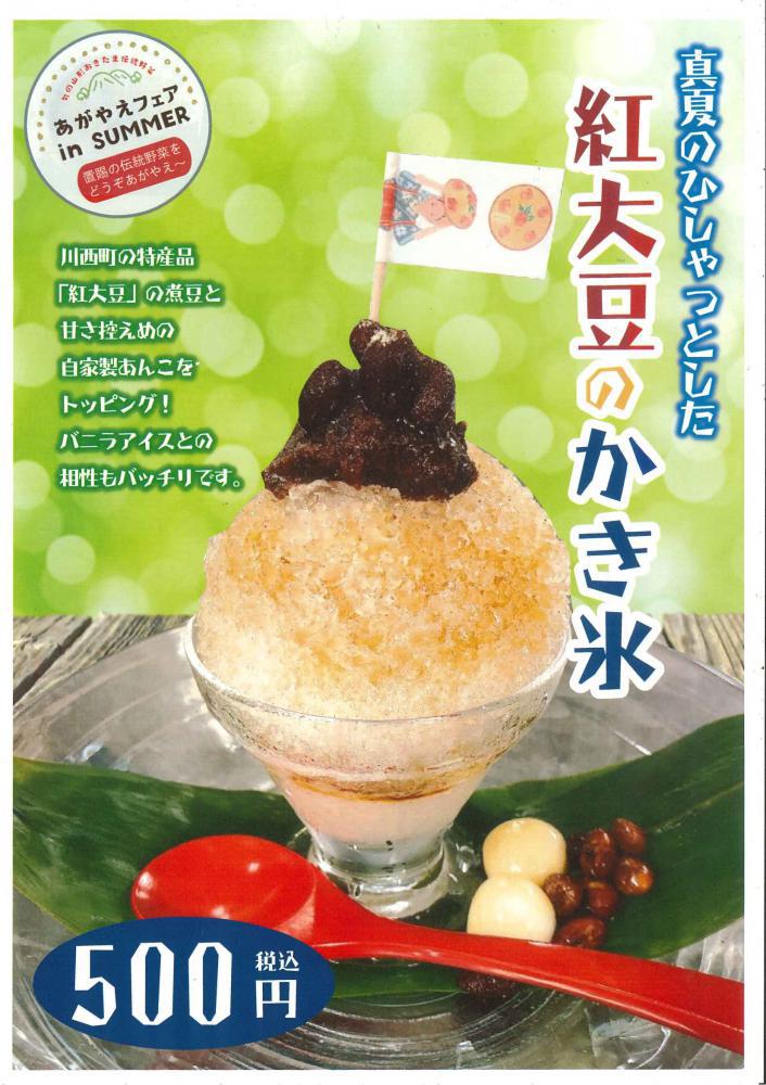 あがやえフェアin SUMMER真夏のひしゃっとした紅大豆のかき氷川西町の特産品の「紅大豆」の煮豆と甘さ控えめの自家製あんこをトッピング!バニラアイスとの相性もバッチリです!! 500税込みです。今だけの期間限定です。ぜひ食べにきて下さい!!
