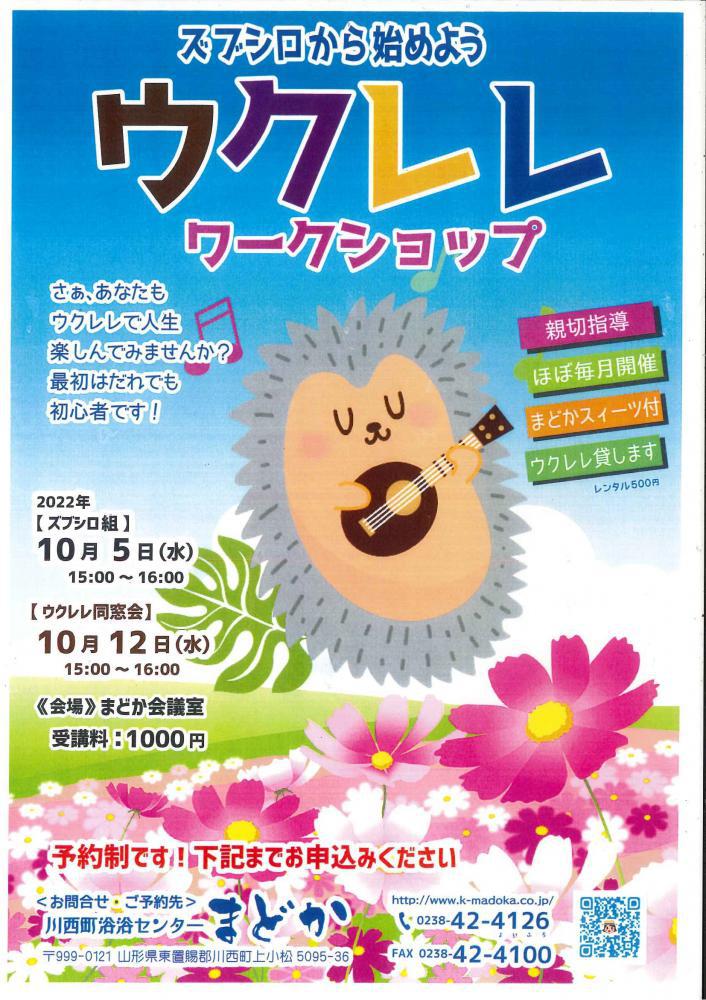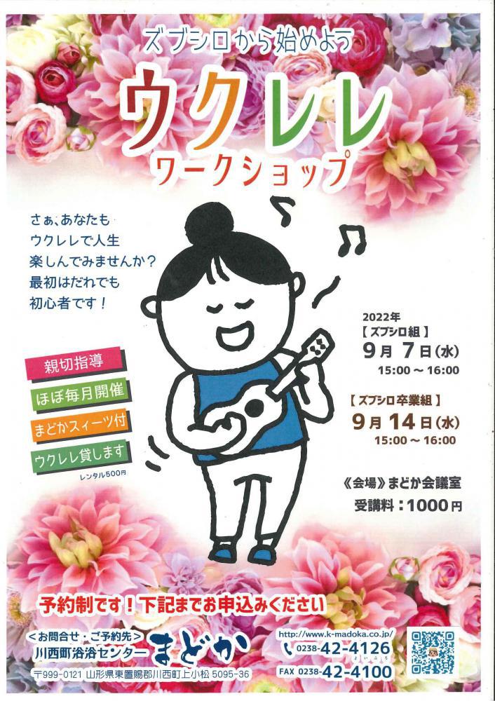 ズブシロからはじめよう♪ウクレレワークショップ★ズブシロ組・・・9月7日(水)・・・15:00〜16:00★卒業組・・・9月14日(水)・・・15:00〜16:00受講料:1,000円(まどか特製スイーツ付)※ウクレレレンタル出来ます(レンタル500円)・親切指導 ・ほぼ毎月開催※まどか会議室さああなたもウクレレで人生楽しみませんか?お申込み先:浴浴センターまどか TEL0238-42-4126