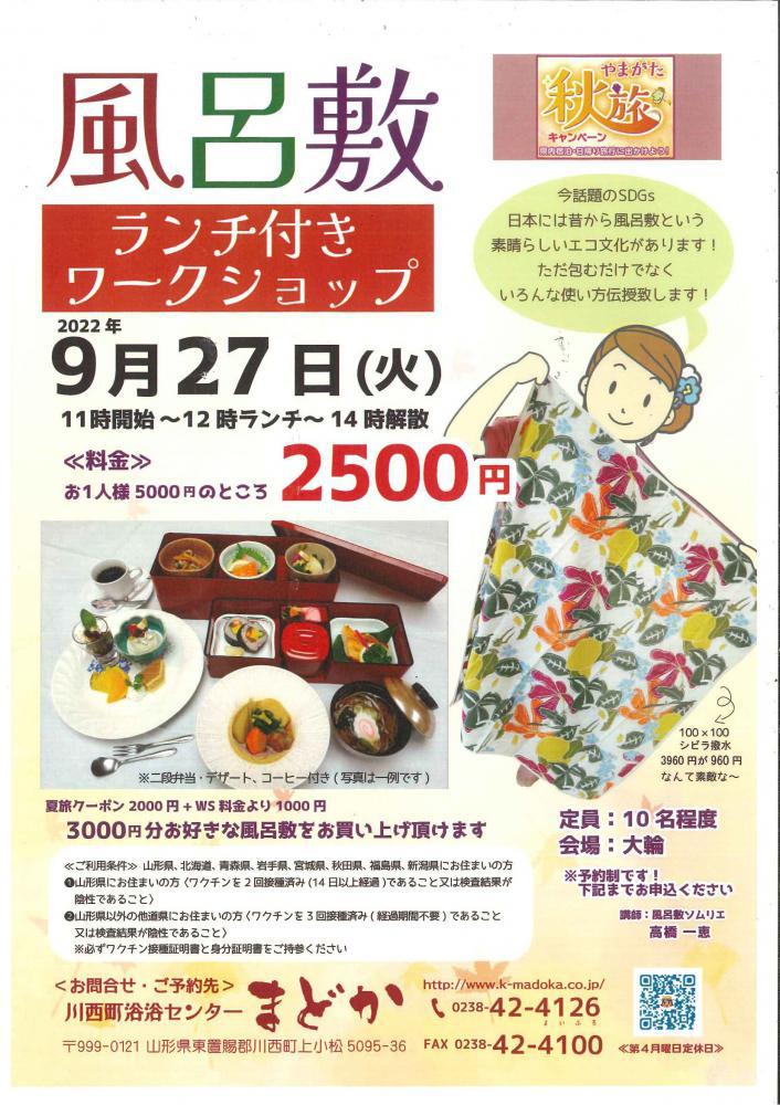 好評に付き9月も開催いたします。2022年9月27日(火) ※完売いたしました!!=秋旅キャンペーン特別企画= 風呂敷ランチ付きワークショップ11時〜ワークショップ12時〜ランチ〜14時解散料金:2,500円税込み会場:まどか大輪(宴会場)定員:10名程度※夏旅キャンペーンのクーポン2000円とワークショップ1,000円で3,000円分で お好きな風呂敷をお買い上げ頂き、参加となります!!※参加にはワクチン接種証明書と身分証明書が必要となります!!※予約制です。浴浴センター まどか TEL:0238-42-4126までお申込み下さいませ!!