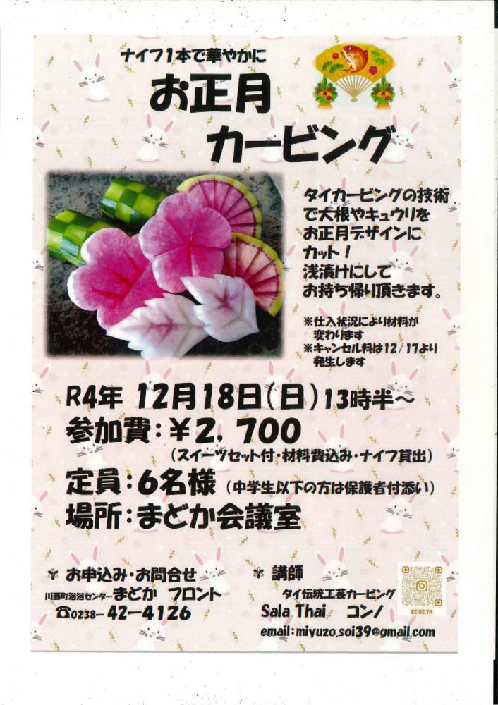 12月18日(日) 13時30分〜参加費:2700円(スイーツセット・材料費・ナイフ貸出し)定員:6名様(中学生以下は保護者付き添い)場所:まどか会議室タイカービングの技術をで大根やきゅうりをカットしてお正月デザインにカット!!浅漬けにしてお持ち帰り出来ます。※予約制となります. ※おかげさまで 定員となりました。ご予約は:0238-42-4126まで