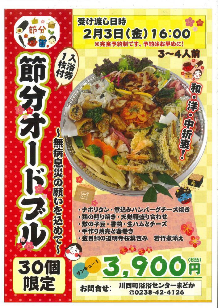 〜まどか節分オードブル〜受け渡し日時:2月3日(金)16:00※予約制 30個限定・・・3900円税込 3〜4人前 入浴券1枚付き☆内容:ナポリタン・煮込みハンバーグチーズ焼き 鶏の照り焼き・天麩羅盛り合わせ 数の子豆・香物・生ハムとチーズ 手作り焼売と春巻き 金目鯛の道明寺桜葉包み 若竹煮添え ★お問い合わせ・予約★ 浴浴センターまどか TEL:0238-42-4126