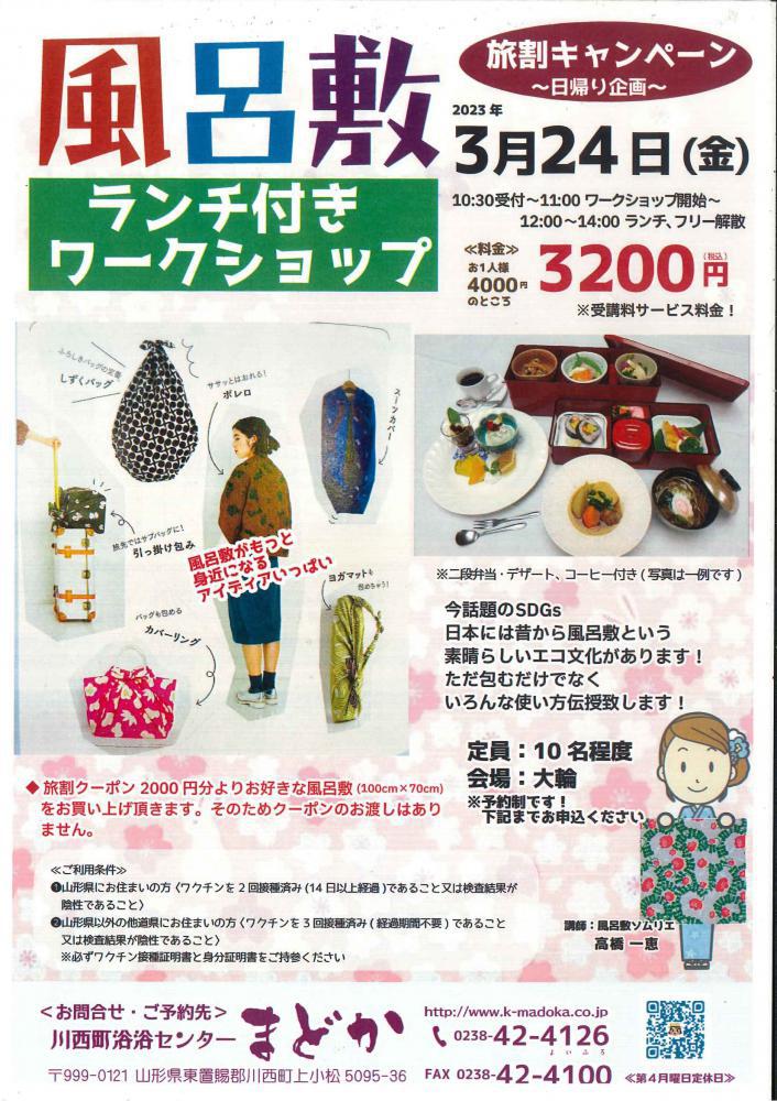 2023.3月24日(金)風呂敷ワークショップ(ランチ付き)〜旅割キャンペーン・日帰り企画〜●時間:10:30〜受付 11:00〜ワークショップ開始〜 12:00〜14:00 ランチ、フリー解散●定員:10名程度●会場:大輪●料金:お一人様4000円の所→3200円(旅割キャンペ-ンで20%OFF)※他旅割地域限定電子クーポン2000円より、お好きな風呂敷(100cm×70cm)をお買い上げできます。そのため、クーポンのお渡しはありません。《ご利用条件》 ワクチン接種証明(県内2回以上)・県外3回以上の接種証明と身分書を持参下さい!!※予約制です。ご予約はTEL0238-42-4126までお申し込みください。