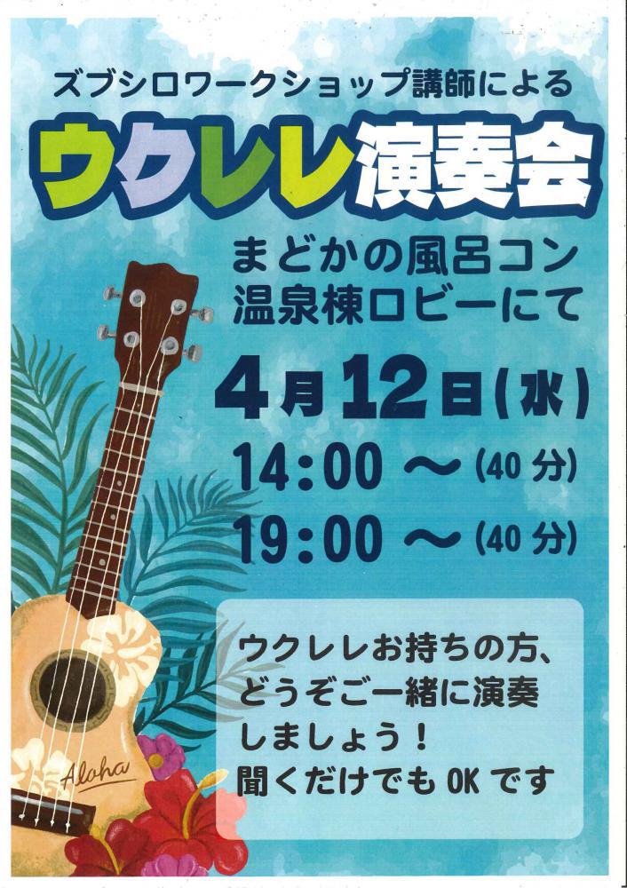 ウクレレワークショップ講師によるウクレレ演奏会開催まどかの温泉棟ロビーにて風呂コン開催!!4月12日(水)●14:00〜(40分)●19:00〜(40分)※ウクレレお持ちの方、どうぞご一緒に演奏しましょう♪どなたでも聴けますよ♪