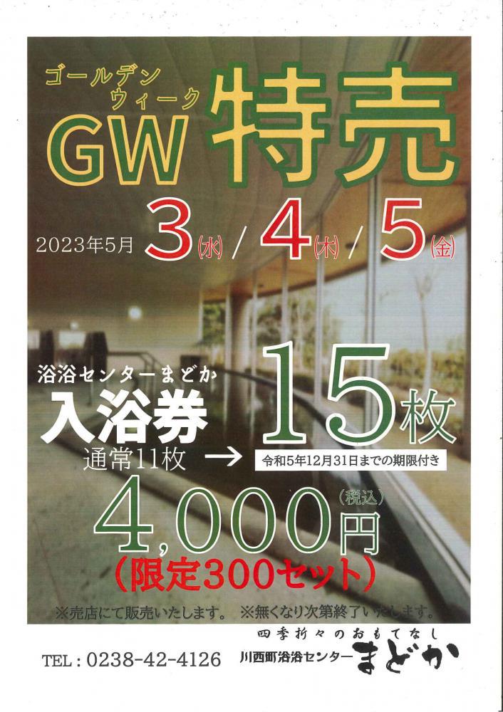 5/3(水)〜5/5(金) 売店で販売!!3日間限定・・・入浴券特売通常11枚で4,000円→15枚で4,000円※11枚+4枚(12/31までの期限付)※1日限定・・・100セットぜひお越し下さい
