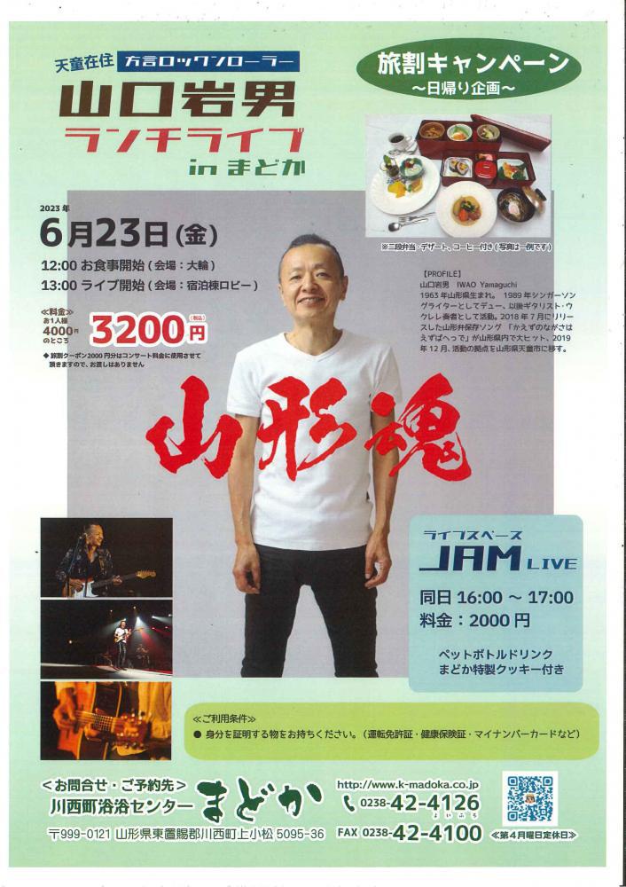 2023.6/23(金)★『山口岩男』ランチライブ開催!!・12:00〜お食事開始(会場:大輪)・13:00〜ライブ開始(会場:宿泊棟ロビー)・お一人様・・・3200円税込(二段弁当・デザート・コーヒー付)※旅割キャンペーン企画に付き、身分証(運転免許証・健康保険証・マイナンバーカード等)身分を証明するものお持ち下さい。※完全予約制:予約は0238-42-4126まで★同日6/23(金) 16:00〜17:00 ライブスペースJAMでLIVEお一人様・・・2,000円税込(ペットボトルお茶・まどか特製クッキー付き)※完全予約制:予約は0238-42-4126まで