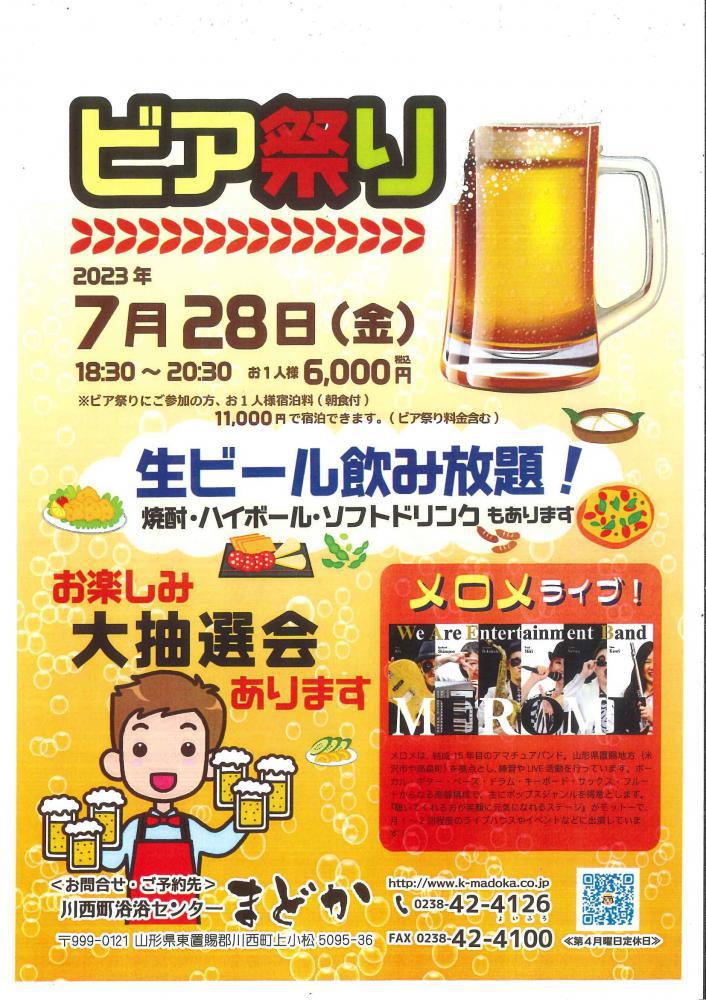 2023年:7月28日(金)まどか:ビア祭り開催!!生ビールのみ放題!(焼酎:ハイボール:ソフトドリンクもあります)※メロメライブ・お楽しみ抽選会もあります。●時間:18:30〜20:30●場所:大輪●料金:お一人様・・・6,000円※ビア祭りにご参加の方、お一人様宿泊料(朝食付) ・・・11,000円で宿泊できます。(ビア祭り料金含む)事前予約です。ぜひご参加お待ちいたしております。浴浴センター まどか Tel0238-41-4126まで!! ※おかげさまで、完売いたしました。