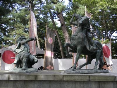 川中島合戦場跡の謙信公・信玄公の銅像。
