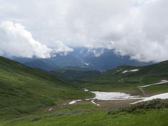月山リフトを降りていよいよ登山へ。山を見渡し、緑や高山植物