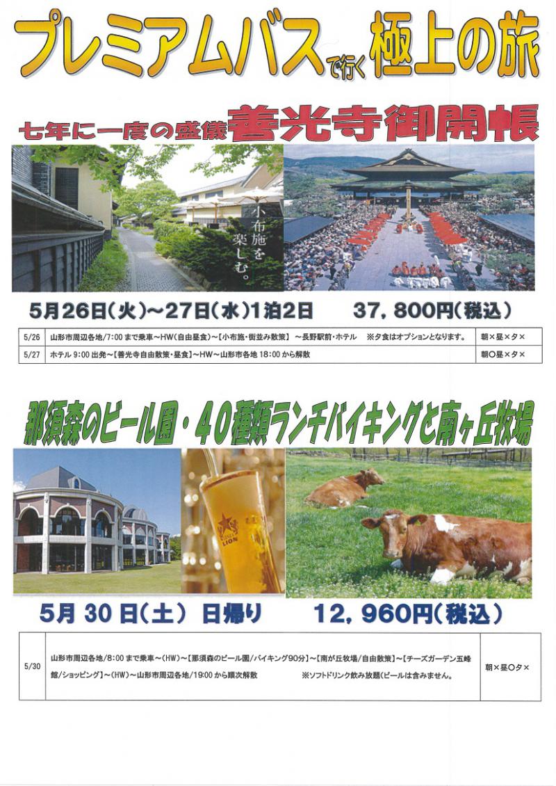 今回は長野善光寺御開帳ツアーと那須森のビール園40種類のバイキングのツアーをご案内させていただきます。