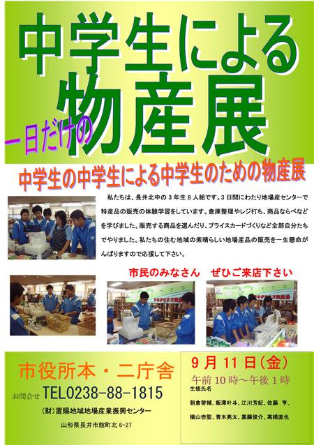 ただ今(財)置賜地域地場産業振興センターでは、長井北中学校3年生の皆さんが職場体験を行っています!倉庫整理やレジ打ち、商品ならべなど日常業務を体験し、明日はなんと長井市役所にて特産品の販売体験を行うことになりました!販売する商品を選んだり、プライスカードを作ったり、準備はすべて彼らが行っています。「僕たちの住む地域の素晴らしい地場産品の販売を一生懸命がんばります」と意気込みも十分!どなたでもご利用できますので、ぜひ彼らの応援に行ってみて下さい。中学生による一日だけの物産展(長井北中学校3年生職場体験)日 時:9月11日(金) 午前10時〜午後1時場 所:長井市役所本庁舎・第二庁舎問 合:(財)置賜地域地場産業振興センター 0238-88-1815【この記事は、ながいファン倶楽部のブログです】☆毎月1日・15日にファン倶楽部会員様へメールマガジンを配信♪▼お申込はこちらから!