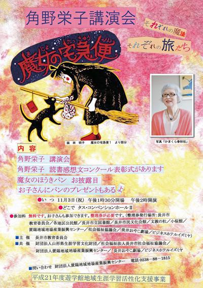 今年の文化の日、「魔女の宅急便」でおなじみの角野栄子さんを迎えて講演会が行われます。戦時中に長井に疎開していたという縁で何度も長井市を訪れている角野さんに、ついに最終巻を迎えた「魔女の宅急便」のことや様々なお話を伺います。当日は、読書感想文コンクールの表彰式や魔女のほうきパンのお披露目もありますよ!ぜひご参加ください。い つ:平成21年11月3日(祝) 午後1時半開場 午後2時開演ところ:タス・コンベンションホールU入場無料!お子様も参加できますが、整理券が必要です。以下の整理券発行場所でお求めください。整理券発行場所:長井市教育委員会、長井市各地区公民館、長井市立図書館、長井市民文化会館、文教の杜、小桜館、置賜地域地場産業振興センター、社会福祉協議会、長井おやこ劇場、ビジネスホテルイズミヤ詳しくはこちらから【この記事は、ながいファン倶楽部のブログです】☆毎月1日・15日にファン倶楽部会員様へメールマガジンを配信♪▼お申込はこちらから!