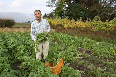 ▲長井市花作町で「花作大根」を作っている横澤芳一さん花作大根は、上杉藩時代から長井市花作町地区で漬け物用として栽培されてきた大根で、独特の歯ざわりと長期保存が可能なことからとても重宝されてきたそうです。しかし、冷蔵庫などの普及により長期保存の必要がなくなってきたことから昭和50年代には栽培する人がいなくなりました。そんな昔ながらの大根を復活させようと平成14年に「ねえてぶ花作大根」(代表 横澤芳一さん)が結成されました。▼花作大根は普通の大根に比べ短く、およそ3分の1の長さです。このねずみの尾のような根から「ネズミノオ」、俗にねずみ大根と呼ばれているのだとか。▼長さは普通の大根の3分の1ですが、辛さは普通の大根の3倍もある辛味の強い大根です。生の薄切りではあまり分からなかったのですが、大根おろしにすると普通の大根より辛いのが分かりました。普通の大根と比べると硬く、水分も少なめで、そばの薬味などにとてもよく合いそうです!生の花作大根に塩味で調理すると苦味が出るため、2〜3ヶ月間塩漬けにしてアクをぬいた後に塩抜きし漬けもの等に加工するそうです。▼平成17年には、イタリアのスローフード協会本部から、後世に残すべき食材を選定する「味の箱舟(アルカ)」の日本で最初の9品目の1つに認定されましたo(*'o'*)oそして、あの銀座のアンテナショップ『おいしい山形プラザ』のレストラン『ヤマガタサンダンデロ』や鶴岡市にある『アル・ケチャーノ』のシェフである奥田シェフが、なんとこの花作大根を注文したのだそうです!!どんなレシピが完成するのか、とっても楽しみですo(^∇^)o▼10月下旬から11月が花作大根の収穫時期で、今日もおいしそうな大根が採れましたよ!硬くて辛いのが魅力の花作大根ですが、葉っぱの部分は他の大根葉より柔らかくてうまいと評判です。▼いなごも収穫を喜んでいます♪【この記事は、ながいファン倶楽部のブログです】☆毎月1日・15日にファン倶楽部会員様へメールマガジンを配信♪▼お申込はこちらから!