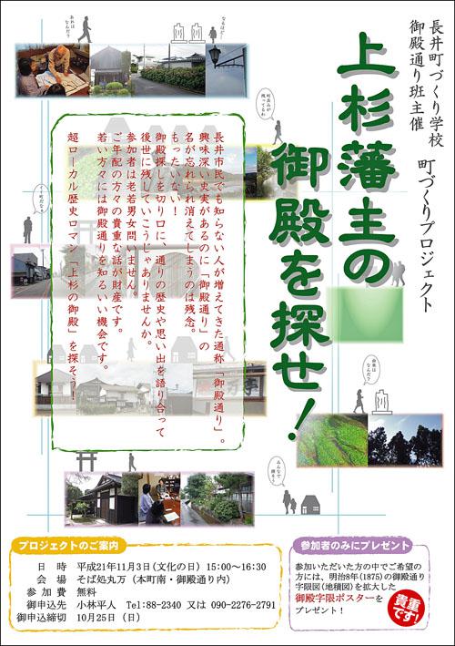 まちの魅力を発見して自分たちで実践するという楽しい企画、「長井まちづくり学校」。御殿通り班主催の町づくりプロジェクト「上杉藩主の御殿を探せ!」が11月3日(文化の日)に開催されます。長井市民でも知らない人が増えてきている通称「御殿通り」。町中にある細道のひとつのようにも思えるこの道に“御殿”と名がつく由来は何?知られざる上杉藩との関係とは!?長井市の歴史ミステリーにせまるワクワク企画です!老若男女のご参加大歓迎とのこと!参加者の中からご希望の方に明治8年(1875)の御殿通り字限図(地積図)を拡大した御殿字限ポスターのプレゼントもあるそうですよ!ぜひご参加ください。日時:平成21年11月3日(文化の日)15:00〜16:30会場:そば処丸万(本町南・御殿通り内)参加費:無料申込先:小林平人 TEL0238-88-2340長井まちづくり学校についてはこちらから辰巳家班食欲の秋!芸術の秋!秋大満喫ツアー!はこちらから【この記事は、ながいファン倶楽部のブログです】☆毎月1日・15日にファン倶楽部会員様へメールマガジンを配信♪▼お申込はこちらから!
