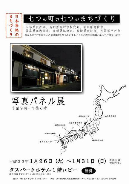 長井まちづくりNPOセンターでは明日より国内の7つの町で行われている「まちづくり」の様子を紹介した。写真展「七つの町の七つのまちづくり」を開催しますv('▽^*)▼いろんな試みが紹介されています素敵な写真がいっぱい!もちろん長井市の様子も紹介されますよ♪▼長井市も紹介!ぜひお越しください(*^ー^*)詳しくはこちらから日本各地のまちづくり「七つの町の七つのまちづくり」写真パネル展期間:2010年1月26日(火)〜1月31日(日)時間:午前9時〜午後6時(最終日は午後4時まで)場所:タス1階展示ホール入場無料です!【この記事は、ながいファン倶楽部のブログです】☆毎月1日・15日にファン倶楽部会員様へメールマガジンを配信♪▼お申込はこちらから!