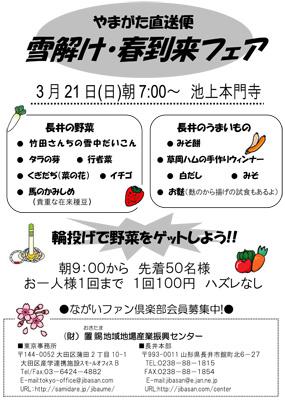春の訪れを待って大田区池上本門寺の朝市が帰ってきました。もちろん地場産チームも参加します!今回の販売品は、タラの芽、行者菜、雪中大根、くぎだぢ(菜の花)、いちごといった春の足音が聞こえてきそうな野菜たちと、保存がきく、長井の郷土料理や調味料です!以前好評だったみそ餅と麸の唐揚げもあります!“輪投げで野菜をゲットしよう!”というイベントも開催!詳しくは地場産東京事務所のブログをご覧ください!日時:平成22年3月21日(日) 朝7:00から場所:大田区 池上本門寺【この記事は、ながいファン倶楽部のブログです】☆毎月1日・15日にファン倶楽部会員様へメールマガジンを配信♪▼お申込はこちらから!