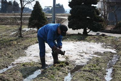 ここ2日くらいの長井市は穏やかなお天気が続いています(o^∇^o)ノ普通の大根より辛味が強く漬け物や薬味にすごく合う「花作大根」の春の収穫を行うということでねえてぶ花作大根の遠藤孝太郎さんの畑をお邪魔しました。▼「さわのはな」「馬のかみしめ」「花作大根」等、安全で良質な在来食品を広めようと頑張っていらっしゃる遠藤孝太郎さん花作大根は通常8月末位に種をまき秋に収穫するんだそうですが、この春に収穫する大根は9月10日頃に種まきをしたものなんだそうです。長井市は8月末から9月半ばにかけて寒暖の差があるため大根の成長に差が出るんだとか。そして秋の生育状況を見て生育の良いものを秋に収穫し、まだ生育が良くないものを土の中に残し春に収穫するんだそうです。普通の大根は長さがあるため冬の間実の(首?頭?)部分が雪に触れて痛んでしまうのに対し、長さが短い花作大根は実の部分がすっぽりと土に隠れているため冬の間も雪の下ですくすくと成長を続けるのだそうです。▼秋収穫した花作大根に比べると若干小ぶりですが、実が締まって繊維が増えるそうです(*^^*)▼春はこの1アールの畑から約150kgの大根を収穫します。▼冬の雪の下でもこんなに立派に育ったんですね!▼収穫された花作大根はアイラップに入れて冷蔵庫で保存します。こうすることで6月位までフレッシュに保てるそうです(ノ゚ρ゚)ノ▼生の大根を切っていただきました。秋のものと比較すると甘味は多少増した気はしますが、辛味は十分に残っています。後からぴりっときます!生の春堀り大根の販売はないそうですが、これからどんどん花作大根の漬物の販売を行っていきます。根強い人気の「はないろだいこん」や「ほろよいだいこん」、そして新発売してからすでにリピーター続出の「なかよしだいこん」を是非この機会にご賞味下さい(^○^)/花作大根の漬物のご購入はこちらから!【この記事は、ながいファン倶楽部のブログです】☆毎月1日・15日にファン倶楽部会員様へメールマガジンを配信♪▼お申込はこちらから!
