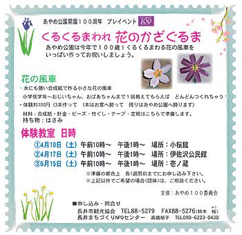 今年はあやめ公園の開園100周年。手作りのかざぐるまを公園に飾ってお祝いしましょう!長井市観光協会と長井まちづくりNPOセンターではあやめまつりのプレイベントとして、あやめ公園を華やかに彩るかざぐるま作りの体験教室を以下の日程で行います。お子さんからお年寄りまでふるってご参加くださいヾ(^∇^)■体験料:100円 (3本作って1本お持ち帰り。2本はあやめ公園へ飾ります)■日 時:1> 4月10日(土)10:00〜 13:00〜 場所:小桜館 2> 4月17日(土)10:00〜 13:00〜 場所:伊佐沢公民館 3> 5月15日(土)10:00〜 13:00〜 場所:壱ノ蔵■申し込み・問い合わせ: ・ 長井市観光協会(担当:鈴木(裕ゆう)) TEL:0238-88-5279 FAX:0238-88-5276 ・ 長井まちづくりNPOセンター(担当:高橋) TEL:090-6223-0430詳しくはこちらからどうぞ(PDF)【この記事は、ながいファン倶楽部のブログです】☆毎月1日・15日にファン倶楽部会員様へメールマガジンを配信♪▼お申込はこちらから!