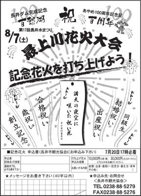 あやめ公園100周年のお祝い花火は綺麗でしたねぇ〜♪(*´▽`*)ノ゛ところで今年はあやめ公園で花火が上がったから夏の花火大会は無いんじゃないかと思っている人もいるのでは?ご心配にはおよびません!今年も8/7(土)のながい水まつりの日に、最上川花火大会が開催されますよヽ(゚◇゚ )ノ長井市観光協会ではただいま記念花火の申し込みを受け付けています。誕生日や結婚祝い、出産祝いに創立記念など記念にしてもらえるならなんでもOKですv('▽^*)大きな花火を打ち上げて、不景気をドッカ〜ン!と吹き飛ばしちゃいましょう!申込締切は7月20日です。お急ぎください!【この記事は、ながいファン倶楽部のブログです】☆毎月1日・15日にファン倶楽部会員様へメールマガジンを配信♪▼お申込はこちらから!