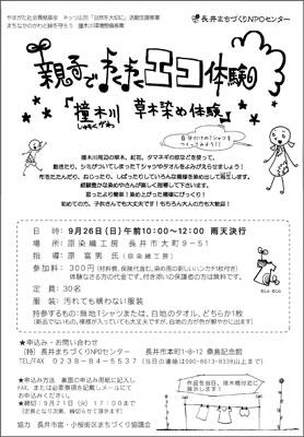 長井まちづくりNPOセンターでは撞木川周辺の草花や玉ねぎの皮などを利用して行う草木染め体験を開催します(^▽^)職人さんの指導のもとTシャツやタオルをリメイク!世界に1つだけのとっておきの1枚を作ってみませんか?ただいま参加者募集中です!定員30名なのでお申し込みはお早めに。問合・申込:長井まちづくりNPOセンター PHONE&FAX 0238-84−5537↓詳しくはこちらからチラシ(表) チラシ(裏)親子でわくわくエコ体験「撞木川草木染め体験」日 時:平成22年9月26日(日)場 所:原染織工房 (長井市大町9-51)指 導:原 富男氏(原染織工房)参加料:300円(材料費、保険代含む。染め用の新しいハンカチ1枚付き)※体験なさる方の代金です。付き添いの保護者の方は無料です。定 員:30名※汚れても構わない服装でご参加ください【この記事は、ながいファン倶楽部のブログです】☆毎月1日・15日にファン倶楽部会員様へメールマガジンを配信♪▼お申込はこちらから!