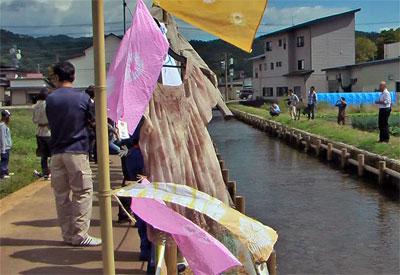 長井のまちなかを流れる撞木川(しゅもくがわ)は長井の歴史や周辺の生活と関わりの深い小川です。この撞木川の保全活動に取り組む(特)長井まちづくりNPOセンターでは、夏のキャンドルナイトに続き親子で体験できる草木染め体験のワークショップを開催しました。▼ぞくぞくと集まる参加者の皆さん会場は撞木川のすぐそばで染め物を行っている原染織工房さんです。この日は藍、紅花、玉ねぎ、月見草、よもぎの5色の染め物にチャレンジしましたv('▽^*)▼よもぎや玉ねぎはお湯で色を煮だしていきますしぼり染めや格子柄、花模様など様々な柄染めにトライできるように、スタッフは前の日に原さんと奥様に布の織り方などを教わりました。できるだけ簡単な方法を教えてもらうのですが、これがなかなかムズカシイ...(゚_゚i) 当たり前ですが職人の道は一朝一夕にはいきません(*^▽^*)▼指導して下さった原さんご夫妻▼絞り染めのポイントを教えて頂きます当日は原さんご夫妻にも指導に入っていただき、約50名の参加者が思いおもいの柄染めを行いました。模様のつけ方に最初は悪戦苦闘していた皆さんも、その面白さにすぐに夢中に!子どもたちはもちろん、大人の皆さんもいつの間にか本気モードですヽ(▽⌒)▼様々な模様染めの準備をする皆さん...どんな模様になるのかなぁ染めの作業は原さんの信任の厚い長岡織物さんが指導して下さいました。大きな寸胴鍋に草花の色を煮だしていきます(゚▽゚*) よもぎや月見草は前日にスタッフが集めたもの。渋めの素敵な色がでます。▼野外の即席染め物ラボ▼よもぎはカーキがかったグレーに仕上がります▼紅花染めは優しいピンクに!▼玉ねぎの皮は鮮やかな黄色になりました月見草はマロングレーに、紅花は優しいピンクに、玉ねぎの皮は鮮やかな黄色に染まりました。よもぎはカーキがかったグレーに仕上がるのですが、薬草としても有名なだけに、身につけるだけで体によさそうです(≧∇≦) ところで今回一番驚いたのは藍染め。なんど染める段階では布がビビッドな黄色になっていくのです!それが空気に触れることで酸化し、撞木川の水で洗って干す頃には鮮やかなブルーに!!「青は藍より出でて…」のはずでは? 本当にびっくりしました('▽^*)▼見事な作品のできあがりです!染め上げた作品は撞木川のほとりに乾燥を兼ねて展示しました。各々が持ち寄った使い古しのタオルやTシャツも見違えるようです☆▼撞木川へ移動▼川のほとりで風にたなびく作品が爽やかです!今回のワークショップはやまがた社会貢献基金ネッツ山形『自然を大切に』活動支援事業の協力で行われました。雑草として刈ってしまう草や、捨てるはずの玉ねぎの皮などで、同じく捨てられる運命だったかもしれない衣類やタオルが美しく再生する過程はまさにエコ!大人にとっても新鮮で感動的な体験でしたo(*^ー゚)※このワークショップの様子は10月20日(水)にYBC山形放送で放映され る予定です。どうぞお楽しみに♪【この記事は、ながいファン倶楽部のブログです】☆毎月1日・15日にファン倶楽部会員様へメールマガジンを配信♪▼お申込はこちらから!