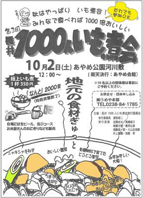 “みんなで食べれば1000倍おいしい!”…ということで、今年も「長井1000人いも煮会」が開催されます。早くも3回目になるそうです(^∇^)いも煮に使う里芋は致芳小学校の児童の皆さんが先週掘ったものだとのこと。当日も河川敷の清掃などにチャレンジする予定です。▼大きな鍋でことこと煮こみます今年はあやめ公園そばの野川河川敷で行います。どなたでも参加できて、極上のいも煮を1杯350円で食べられますよ!その上大勢でいも煮をほおばるプライスレスな体験もできちゃいますよ!ぜひ行ってみて下さい!!第3回長井1000人いも煮会日時:平成22年10月2日(土) お昼12:00より場所:あやめ公園野川河川敷(雨天:あやめ会館)極上のいも煮1杯:350円※10名以上の団体は事前申込が必要です((株)うめや本部0238-84-1785)【この記事は、ながいファン倶楽部のブログです】☆毎月1日・15日にファン倶楽部会員様へメールマガジンを配信♪▼お申込はこちらから!