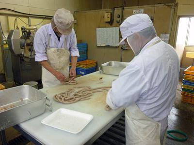 今週末のおおた商い観光展2010でのお披露目に向けて、草岡ハムで密かに?開発が進められていた新商品が完成しました(*^ー^*)その名も!大田のり入りウインナーア〜ンド大田のりのりフランクです!▼腸詰め作業…やっぱり海苔の香りがするんでしょうか東京都大田区の大森地区は江戸前海苔の名産地。その歴史は江戸時代中期まで遡ることができるそうです(ノ゚ο゚)ノ そんな歴史ある海苔と農家の手造りが自慢の草岡ハムがタッグを組んでどんなミラクルな味が生まれるのか楽しみですね(*^▽゚ *)▼手際良く作られていきますおおた商い観光展では真空パックの大田のり入りウインナー(130g¥380-)とその場で食べられるあっつ熱の大田のりのりフランク(350-)を販売しますヾ(^∇^)さらに!「東京までなど行がんにごでぇ」という長井市周辺の皆さんにも味わっていただくべく、明日14日よりおらんだ市場菜なポートにて大田のり入りウインナー(130g ¥380-)のみ先行販売しますよ!▼どんな味になるのかなぁ…※製造工程については東京事務所のブログをご覧くださいパスタにだってフライドポテトにだって海苔をかけてしまう日本人にはたまらない組み合わせの新商品!この週末はおおた商い観光展と菜なポートでぜひお試しください。限定販売ですのでお早めに!草岡ハムのこの他の商品お求めはこちらから【この記事は、ながいファン倶楽部のブログです】☆毎月1日・15日にファン倶楽部会員様へメールマガジンを配信♪▼お申込はこちらから!