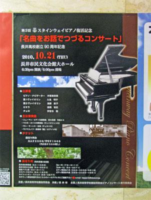 ピアノの名器として知られるスタインウェイ。テレビ等で“STEINWAY& SONS”と記されたグランドピアノが登場すると、なんとなく「ちゃんとしてるんだなぁ〜」と感心するものです(…本当か?^^;)そんなスタインウェイのピアノが長井にやってきたのは何と大正14年のこと。篤志家の方々によって女学校に寄贈されたこのピアノは長い間、県立長井高等学校の同窓会館に放置されていました。合宿の時に見た記憶のある卒業生の方も多いですよねo(^0^)o同窓会がこのピアノを修理して復活させたのが7年前。本来の音を取り戻したスタインウェイピアノを披露する3回目の復活記念コンサートが明日、長井市民文化会館で開催されますv(*'-^*)-☆ピアノとナビゲーションに“美しすぎるピアニスト?”の木曽 真奈美さんを迎え、ヴァイオリンとビオラ、チェロを加えて送るスペシャルなコンサートです(*^▽^*)バンクーバー五輪で日本中を熱狂させた浅田真央選手のフリー演技で使用されたラフマニノフの「鐘」や胎教に最適と噂されるモーツァルトの曲、映画「ティファニーで朝食を」の「ムーン・リバー」なども演奏されるようですよ。数々の名曲を一流のプレーヤーの演奏で楽しむことができるまたとない機会です。詳しくは葉っぱ塾さんのブログをご覧ください(←こちらをクリック)コンサートの名称 第3回スタインウェイピアノ復活記念「名曲をお話でつづるコンサート」〜長井高等学校創立90周年記念〜■日時:2010年10月21日(木) 午後6時30分開演(6時開場)■会場:長井市民文化会館ホール■料金:前売料金 大人¥2,500 学生¥1,000(当日各¥500増)■主催:長井高等学校鷹桜同窓会■共催:長井市■主管:長井高等学校鷹桜同窓会ピアノコンサート実行委員会【この記事は、ながいファン倶楽部のブログです】☆毎月1日・15日にファン倶楽部会員様へメールマガジンを配信♪▼お申込はこちらから!