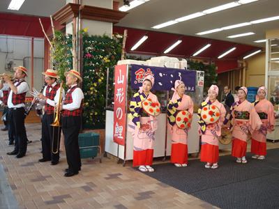 3月5日から9日までダイシン百貨店リニューアルオープンイベント「山形長井市フェア」を開催中!!まだまだ春は来させないぞ!とばかりの零下の雪の長井を出発したら・・・ 歓迎とばかりに快晴!青空のもと5日9時オープン(^∇^)販売の準備も万端! 長井ならではの焼き麩もてんこ盛り(*゚◇゚*)リニューアルオープンを記念し、山形の新しいお米「つや姫」の試食や玉こんのふるまい、みそ餅の試食など、ド〜ン!と太っ腹しちゃいました(^ω^*)今フェアのメインイベントw(*゚o゚*)wは「ヤッショ、マカショ!!」と威勢のいい掛け声と艶やかな衣装で山形の真夏の夜を焦がす華麗なまつり、東北4大まつりの一つで知られている花笠おどりを披露しました。民謡の花笠おどりはもちろん、 実は・・・ たぶん今まで見たことのないすっごいコラボがあったんです。(後ほどわかりますよ(゚-^*)踊ってくださったのは直派若柳会『長井若柳会』のみなさんです。長井若柳会さんの活動範囲は国内はもとより海外にも及んでいて、ヨーロッパでは公演したことのない国はないくらい広範囲で大活躍されている名高い会なんです(*゚○゚*)花笠おどりは5日・6日の午前、午後と4回公演を行いました。まずはダイシン百貨店入り口でお客様お出迎え(一番上の写真です)。艶やかですねぇ(=*^-^*=)その後でバンドのリズムに合わせ1階から公演会場の屋上まで店内を歩いてPRしてくださいました。長井若柳会さんは第1回目の花笠パレードから踊ってるんですって...スゴイ!!民謡花笠おどりが終わり、ついに出ました(゚O゚) ディキシーランドジャズとのコラボ。ディキシーランドジャズバンド『ホットキャッツ』さんの生演奏での花笠おどり。ジャズとコラボなんて誰が思いついたんでしょうね(^_^;)でも、さすがプロ!!(-_^) どんなテンポでも合わせられます。見ごたえバッチリのコラボ!普段の花笠おどりとはまさに別物でしたよ。最終公演後は惜しみながらも満面な笑みで集合写真(*~∇~*)本場山形の花笠おどりをご覧になられたお客様、いかがでしたでしょうか。また、すばらしい花笠おどりをで観客を魅了してくださいました長井若柳会のみなさん、本当にありがとうございました。山形長井市フェアは9日まで開催されます。8日は11:00〜、15:00〜 米粉きつねうどんのふるまい。最終日9日は11:00〜 米粉ひっぱりうどんのふるまい。そして12:00からは、ありがとう感謝セールが開催されます。是非お立ち寄り下さいませ*★ 【この記事は、ながいファン倶楽部のブログです】☆毎月1日・15日にファン倶楽部会員様へメールマガジンを配信♪▼お申込はこちらから!