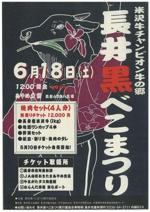 6月18日(土)にあやめ公園高台ふれあい広場にて「長井黒べこまつり」が開催されます(^O^)日本の和牛の中でも最高ランクに位置する黒毛和牛の「米沢牛」。毎年3回、チャンピオン牛を決める「米沢牛枝肉共進会」が行われており、長井市産の米沢牛も過去何回もチャンピオン牛を輩出しています(^▽^)そんな米沢牛で焼肉を堪能する「長井黒べこまつり」に参加しませんか?(^^)+++++++++++++++++++++++++++++日 時 6月18日(土)12:00開会(11:30受付開始)会 場 あやめ公園高台ふれあい広場入場券 12,000円(1セット4人分) 限定88枚内 容 長井産米沢牛(1Kg)、野菜セット、地酒ワンカップ4本(箸・皿・タレ込)※お飲み物については会場屋台でお求めいただけます。+++++++++++++++++++++++++++++チケットは長井市農林課、JA山形おきたまあやめ支店、やまがたタス物産館、おらんだ市場菜なポートでお求め頂けます!▼昨年は青空の下でたくさんの参加者が美味しい焼肉を楽しみました▼贅沢!昨年はチケットもすぐ完売してしまいました...のでお求めはお早めに!!【この記事は、ながいファン倶楽部のブログです】☆毎月1日・15日にファン倶楽部会員様へメールマガジンを配信♪▼お申込はこちらから!*.*:*.*:*.*:* がんばろう東北!がんばろう日本! *.*:*.*:*.*.*ながいファン倶楽部チャリティーポストカードセットはこちらから震災における長井市の対応はこちらから(長井市ホームページ)長井市災害避難者支援ボランティア本部のブログはこちらから長井市でも支援の輪が広がっています→こちらからどうぞ長井市生活情報マップはこちらから仕事を提供するという支援〜サイトーモールド被災地への義援金についてはこちらから地震関係Q&A(山形県ホームページ)計画停電について(東北電力ホームページ)