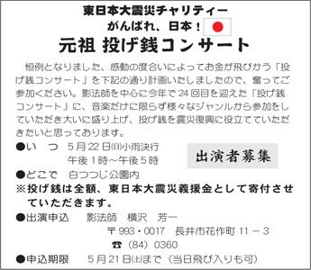 黒獅子まつりの感動冷めやらぬ翌日5月22日(日)には、同じく白つつじ公園にて、こちらも恒例の元祖投げ銭コンサートが開催されます(*^ー^*)興奮と感動のレベルに合わせてお金が飛び交う、厳しくも温かい?投げ銭コンサート。長井市を中心に活動するアマチュアフォークソンググループ影法師の皆さんの呼びかけで始まり、今年で24年目を迎えるそうですw(*゚o゚*)w▼影法師の皆さん(…但し3/4名 at 長井駅^^;)今回は東日本大震災の復興を願うチャリティーコンサートとして開催し、投げ銭は全額、義援金として寄付するそうです!音楽だけでなく様々なジャンルから参加してもらって盛り上げたいとのこと。日ごろ密かに研鑽を積んでいるちょっとした特技を披露する絶好のチャンスかもしれません(けん玉とか、手品とか、ものまねとか…でもいいんじゃないですかね)。▼白つつじもきっと見ごろを迎えているはずです!出演申し込みは5月21日(土)まで影法師 横沢 芳一さん(TEL 0238-84-0360)までお願いします。当日の飛び入り参加もOKだそうですよ!ふるってご参加ください。日時:2011年5月22日(日) 13:00〜17:00(小雨決行)場所:白つつじ公園内(長井市)詳しくはこちらから(広報ながい PDF)【この記事は、ながいファン倶楽部のブログです】☆毎月1日・15日にファン倶楽部会員様へメールマガジンを配信♪▼お申込はこちらから!*.*:*.*:*.*:* がんばろう東北!がんばろう日本! *.*:*.*:*.*.*ながいファン倶楽部チャリティーポストカードセットはこちらから震災における長井市の対応はこちらから(長井市ホームページ)長井市災害避難者支援ボランティア本部のブログはこちらから長井市でも支援の輪が広がっています→こちらからどうぞ長井市生活情報マップはこちらから避難者支援事業所一覧(ながいタウンなび)仕事を提供するという支援〜サイトーモールド被災地への義援金についてはこちらから地震関係Q&A(山形県ホームページ)計画停電について(東北電力ホームページ)