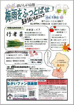 東京は梅雨真っただ中だそうですが、晴れるかな?晴れるかな?晴れるといいなぁと思う明日の池上朝市です。今回も遠路はるばる山形から美味しいものを持っていきますよ!7、8月はお休みということで、東京の皆さまとはしばしのお別れ(^^;)早起きのオトクを満喫しにどしどしお越しください。詳しくは東京事務所のブログをどうぞチラシはこちらから(PDF)【この記事は、ながいファン倶楽部のブログです】☆毎月1日・15日にファン倶楽部会員様へメールマガジンを配信♪▼お申込はこちらから!*.*:*.*:*.*:* がんばろう東北!がんばろう日本! *.*:*.*:*.*.*ながいファン倶楽部チャリティーポストカードセットはこちらから震災における長井市の対応はこちらから(長井市ホームページ)長井市災害避難者支援ボランティア本部のブログはこちらから長井市でも支援の輪が広がっています→こちらからどうぞ長井市生活情報マップはこちらから