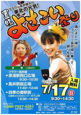 フラワー長井線の沿線から東北の元気を発信しよう!置賜地方で活動するよさこいソーランのチームか結集する置賜よさこい祭りが7月17日(日)に開催されます(ノ*^▽)ノ 主催は11のよさこいチームで結成されたおきたまよさこい協議会。今回はこの中から10のチームが参加します。例年5月に南陽市中央花公園で盛大に行っている置賜よさこい祭りですが、3月の東日本大震災を受けて今回は開催を断念。しかし「こんな時だからこそよさこいの灯を消してはいけない!」とメンバーが奮起!いつものように協賛金を募ることなく、メンバーの力だけでイベントを開催することにしました!震災以降、元気をなくしている地元を盛り上げようと、フラワー長井線の3つの駅で演舞をおこないます!参加する踊り手の皆さんも素敵な衣装のまま、自ら切符を買ってフラワー長井線で移動するそうです。よさこいに興味を持っている人なら、チームの皆さんと仲良くなれるまたとないチャンスですよねv('▽^*)参加10団体のうち、長井市からは姫憂兎(きゅーと)の皆さんが参加。▼長井おどり大パレードに参加する姫憂兎の皆さんテーマはファイアーガール in 長井。新長井おどりをモチーフにしたオリジナル曲で踊ります。南陽市の赤湯駅から白鷹町の四季の郷駅まで。地元のものを食べ、踊り手の皆さんと列車に乗り、よさこいを楽しむ小旅行を満喫してみるのはいかがでしょうか?熱く!元気な置賜よさこい祭りに是非お集まりください!!小雨決行、入場無料です!※フラワー長井線の切符は各自ご購入下さい期日:平成23年7月17日(日)場所:赤湯駅西口広場 9:30〜10:30 長井駅前広場 11:40〜12:40 四季の郷駅前 13:30〜14:30 (白鷹町文化交流センターAYu:M(あゆーむ) )詳しくはこちらから(PDF)【この記事は、ながいファン倶楽部のブログです】☆毎月1日・15日にファン倶楽部会員様へメールマガジンを配信♪▼お申込はこちらから!*.*:*.*:*.*:* がんばろう東北!がんばろう日本! *.*:*.*:*.*.*ながいファン倶楽部チャリティーポストカードセットはこちらから震災における長井市の対応はこちらから(長井市ホームページ)長井市災害避難者支援ボランティア本部のブログはこちらから長井市でも支援の輪が広がっています→こちらからどうぞ長井市生活情報マップはこちらから