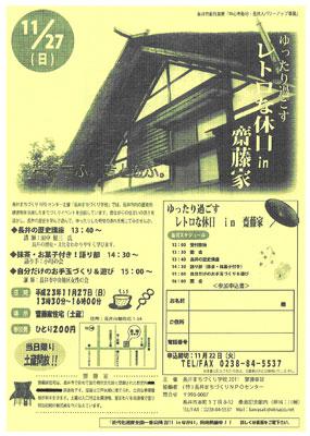 長井市のことを学んで、市内の様々な資源を活かしたイベントを開催する長井まちづくり学校。長井まちづくりNPOセンターの呼びかけで開催され、今年で3年目を迎えていますヾ(^∇^)今期は近代化遺産全国一斉公開にあわせて、市内の近代化遺産を舞台にしての企画を班ごとに計画、実践していますが、趣深い日本家屋・齋藤家住宅での催しを企画する齋藤家班では、この週末、晩秋の穏やかな休日を演出する企画、ゆったり過ごす レトロな週末 in 齋藤家を開催します(ノ*^▽)ノ齋藤家住宅の母屋は江戸時代に建てられた茅葺屋根。国の有形文化財に指定されています。イベントは明治初期に建造された土蔵を開放して行われるとのこと。現在も住宅として使用されている民家だけに、貴重な機会になること間違いなしです。歴史とともに佇む空間で、昔を学び、昔と遊ぶ楽しい企画です。ぜひご参加ください!ゆったり過ごす レトロな週末 in 齋藤家日 時:平成23年11月27日(日)13:30〜16:00◆長井の歴史講座:13:40〜(講師:田中 健三氏)◆抹茶・お菓子付き!語り部:14:30〜(小町の会)◆自分だけのお手玉づくり&遊び:15:00〜(長井市中央地区女性の会)場 所:齋藤家住宅(長井市館町北1-34)参加費:200円お問合せ・申し込みなどは下記までご連絡下さい。〒993-0007長井市本町1丁目8-12 桑島記念館内長井まちづくり学校2011 斉藤家班(担当:川崎)TEL/FAX:0238-84-5537 Mail:kawasaki@okisapo.net詳しくはこちらから(長井市ホームページ)【この記事は、ながいファン倶楽部のブログです】☆毎月1日・15日にファン倶楽部会員様へメールマガジンを配信♪▼お申込はこちらから!▼何やら語っでます☆長井市プレミアム商品券(大判・小判プレミアム長井)完売致しました☆お買い上げありがとうございました。商品券の有効期限は平成24年1月3日までとなります。お使い残しのないようよろしくお願いいたします。*.*:*.*:*.*:* がんばろう東北!がんばろう日本! *.*:*.*:*.*.*長井市生活情報マップはこちらから