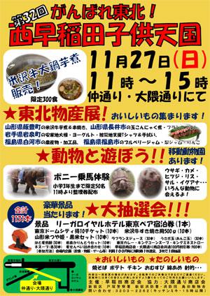 地場産センターで昨年から出展させていただいている西早稲田商店街で行われる「西早稲田子供天国」に今年も参加させていただくことになりましたv(^ー^)v明後日11月27日(日)の11時から開催されます!今年は「がんばれ東北!」の呼びかけのもと、山形県・岩手県・福島県の東北物産展が開かれ、東北のおいしいものが勢ぞろい(゚▽゚)山形県からは飯豊町の米沢牛芋煮と串焼き、長井市の玉こんにゃくとフランクフルトを販売します(^^)また、動物と触れあえる楽しいイベントや豪華商品があたる大抽選会が行われます。詳しくはこちら...☆【この記事は、ながいファン倶楽部のブログです】☆毎月1日・15日にファン倶楽部会員様へメールマガジンを配信♪▼お申込はこちらから!▼つぶやいています☆長井市プレミアム商品券(大判・小判プレミアム長井)完売致しました☆お買い上げありがとうございました。商品券の有効期限は平成24年1月3日までとなります。お使い残しのないようよろしくお願いいたします。*.*:*.*:*.*:* がんばろう東北!がんばろう日本! *.*:*.*:*.*.*長井市生活情報マップはこちらから