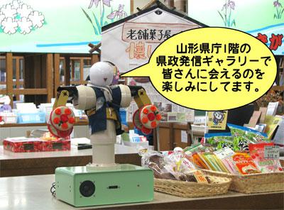 (財)置賜地域地場産業振興センターと西置賜産業会が開発中のゆるキャラロボット“ニシオキタマル君”が、本日より山形県庁1階の県政発信ギャラリーに展示されています(〜12月28日まで)長井市の特産品であるけん玉をモチーフにしていて、色白なスキンヘッドがキモ可愛い?ニシオキタマル君(ネーミングもダイレクトです^^;) お辞儀やおもてなしの動作をし、録音した音声を流すこともできますd('▽^*)ぬいぐるみを着せたりカスタマイズすることも可能で、企業のイメージキャラクター等に変身させることもできるんですよ!▼あやめちゃんにカスタムすることもできますねo(*^ー゚)今回の展示はやまがた地域産業応援基金(旧やまがた産業夢未来基金)の助成を受けた事業を紹介しているもの。他にも県内の様々な取り組みを知ることができます。企業の受付や病院の待合室などで、気持ちをほっこりさせてくれるロボットとしての活躍が期待されるニシオキタマル君。まずは県庁に会いに来て下さい!【この記事は、ながいファン倶楽部のブログです】☆毎月1日・15日にファン倶楽部会員様へメールマガジンを配信♪▼お申込はこちらから!▼つぶやいています*.*:*.*:*.*:* がんばろう東北!がんばろう日本! *.*:*.*:*.*.*長井市生活情報マップはこちらから