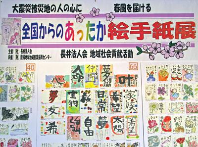タス1階では今日から大震災被災地の人の心に春風を届けるあったか絵手紙展を開催中です(〜12月4日まで)。東日本大震災の被害を受けて、絵手紙株式会社の呼び掛けにより全国から集まった励ましや応援の絵手紙は約1万点に及ぶとのことw(*゚o゚*)wスペースの都合により、今回はその内3500点を借りうけ、(社)長井法人会の主催で展示を行っています。▼ずらり!3500点が展示されていますこの展覧会はこれまでも全国各地で開催され、それぞれの会場で来場の皆さんから被災地に向けたメッセージをいただいています。集まったメッセージは冊子にし、仮設住宅の集会所に届けられるそうです(^-^*)▼全国から寄せられた心温まる絵手紙ばかりですあまりに大きな災害だっただけに、復興への道のりは簡単そうではありません。展示されている絵手紙にも、鼓舞するようなものばかりでなく、被災された皆さんの心に寄り添い、いたわるようなメッセージが多く見られ、印象的でした(*'-'*)▼長井市からもたくさんのメッセージを届けましょう!時間が経過してもエールを送り続けることを忘れないように、長井市でも多くの人に見ていただき、そしてたくさんのメッセージを寄せていただきたいと思います(*^▽^*)大震災被災地の人の心に春風を届けるあったか絵手紙展日 時:平成23年12月2日(金)〜4日(日) 10:00〜17:00主 催:(社)長井法人会共 催:(財)置賜地域地場産業振興センター入場無料【この記事は、ながいファン倶楽部のブログです】☆毎月1日・15日にファン倶楽部会員様へメールマガジンを配信♪▼お申込はこちらから!▼つぶやいっter☆長井市プレミアム商品券(大判・小判プレミアム長井)完売致しました☆お買い上げありがとうございました。商品券の有効期限は平成24年1月3日までとなります。お使い残しのないようよろしくお願いいたします。*.*:*.*:*.*:* がんばろう東北!がんばろう日本! *.*:*.*:*.*.*長井市生活情報マップはこちらから
