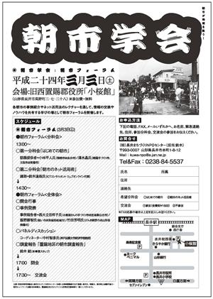 様々な出店者がひとつの場所で行う『朝市』。販売ももちろん地域のコミュニケーションをとることによって地域活性化につながる大事な役割をもっています。長井市でも朝市が地域で行われたりします('U'*)そして今回、地域活性化につながる朝市について各地で行われている朝市の情報交換やノウハウを共有する会として『朝市学会』が3月3日、4日に行われることになりました(*゚▽゚)昨年2月に行われ好評だったため第2弾です!!1日目の明日は朝市フォーラムとして長井市の小桜館で講師の先生の講演、事例報告また、パネルディスカッションが行われます。2日目は南陽市交流プラザ蔵楽で朝市まつりが行われます!長井市からの出店もあるようです。これから春にかけて朝市も多くなってきます。ぜひ朝市について学んでみてはいかがでしょう(^^)詳細・お問い合わせはこちらから(ながいまちづくりNPOセンター)【この記事は、ながいファン倶楽部のブログです】☆毎月1日・15日にファン倶楽部会員様へメールマガジンを配信♪▼お申込はこちらから!▼twitter*.*:*.*:*.*:* がんばろう東北!がんばろう日本! *.*:*.*:*.*.*長井市生活情報マップはこちらから