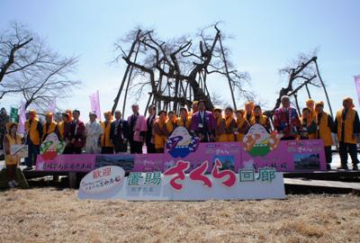 3日、4日の全国的な大嵐(暴風!?)から10日。あの強い風で久保桜は大丈夫かなぁと心配をしましたが、無事のようです!時々ぽかぽか日和が訪れ、春を感じられる長井市です。本日、天気にも恵まれ置賜さくら回廊のスタートを告げる“花咲けイベント”が長井市伊佐沢の久保桜で開催されました!ヽ(*^O^*)ノ▼久保桜〜樹齢は1,200年といわれている、山形を代表する巨木久保桜は、全国的にも有名でご存知の方も多いと思います(*^-^*)種類は「エドヒガン」、国指定天然記念物です。イベントは、置賜さくら回廊のルートとなる2市1町(南陽市、長井市、白鷹町)の関係者が集合し、置賜さくら会の会長が「(人も桜も)自分の命がある限りがんばっていると思います。これからもよろしくお願いします」とあいさつし、置賜さくら回廊がスタートしました!▼置賜さくら会会長の挨拶郵便局さんより桜のフレーム切手の贈答式も行われました。▼いろいろなデザインの法被がまぶしい☆ですね♪▼きれいです今年の置賜さくら回廊は鏡開きを行いました!お酒は鈴木酒造店長井蔵さんの一生幸福です。▼3・2・1!鏡開きが終わると、桜のそばで寝ていたらしい(!)花咲か爺さんが「な〜にしったなや、おまえんだあ〜なんだゃまずぅ※」と颯爽と登場!(※何してるんだー、あなた達は?何ことですか?)▼花咲かじいさん。寝ていたわりにバッチリメイク♪たくさんの人に驚いて、まだ咲いていない久保桜を見て・・・「花咲がせんなねべ!」とボランティアガイドの皆さんと一緒にと魔法の粉?をまいてくれました(ノ*^▽)ノ~~・゜「はな咲げー!」との掛け声で南陽えくぼの里案内人、ながい黒獅子の里案内人、しらたか旅先案内人の皆さんと一緒に魔法の灰をふりかけました▼花、咲けー!いっぱい咲けー!必ず今年もきれいな花がたくさん咲きますね(〃^-^〃)置賜さくら回廊を祈念して今年は声高らかにお酒ではなく、甘酒で▼かんぱーい!▼さくら饅頭のお振舞いも行われました。突然、不思議な『久保桜のつぶやき』がはじまりました。1200歳になった久保桜は同級会をしたんだそうですよ!岐阜 の根尾谷淡墨桜(聞き間違ってたらごめんなさい)と長井市草岡の大明神桜と3木でだそうですー!おもしゃい話でした♪▼代理で語ってくれた田中さん観光タクシーの出発式も行われ、緑のちゃんちゃんこを来たドライバーが出陣しました。▼先頭がれとろんです▼さくらのつぼみは膨らんできてます▼花が咲いた久保桜この写真はチャリティーポストカードの1枚です。はなが咲きそろうと、一段と存在感を増します!置賜さくら回廊には国の天然記念物や古木名桜が数多くあります!世界に誇れる故郷の桜を多くの人に観に来てもらいたいものです。ぜひござっておごやえなぁ〜!★詳しい日程はこちらから★★置賜さくら回廊フォトコンテストもあります。【この記事は、ながいファン倶楽部のブログです】☆毎月1日・15日にファン倶楽部会員様へメールマガジンを配信♪▼お申込はこちらから!▼twitter*.*:*.*:*.*:* がんばろう東北!がんばろう日本! *.*:*.*:*.*.*長井市生活情報マップはこちらから